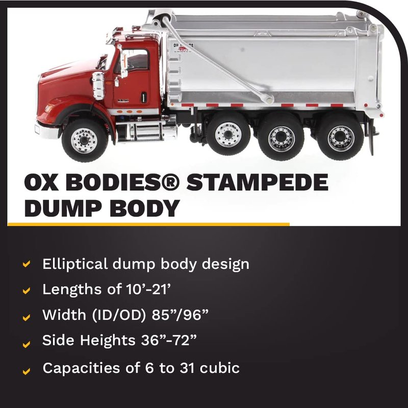 - AUTHENTIC SCALE REPLICA W/ OUTSTANDING DETAILS - Diecast Masters replicas come with accurate interior and exterior details. The Dump Truck (GVWR: 52,000-92,000 lbs) is complete with HX620 Tandem Axle, Cummins ISX15 engine, 450-600 HP, and 1,650-2,050 lb.-ft torque. Sloped, three-piece Metton Hood, Huck-Spin fasteners on frame and crossmembers, and Ox Bodies Stampede Dump Body. Functioning elliptical dump body design, opening hood and tailgate. Includes removeable exhaust tip and trailer hitch.