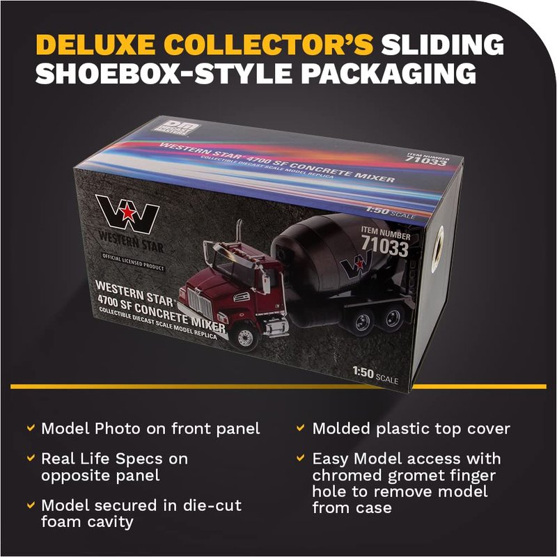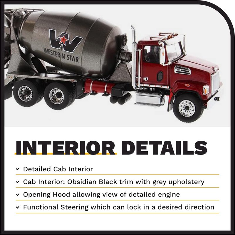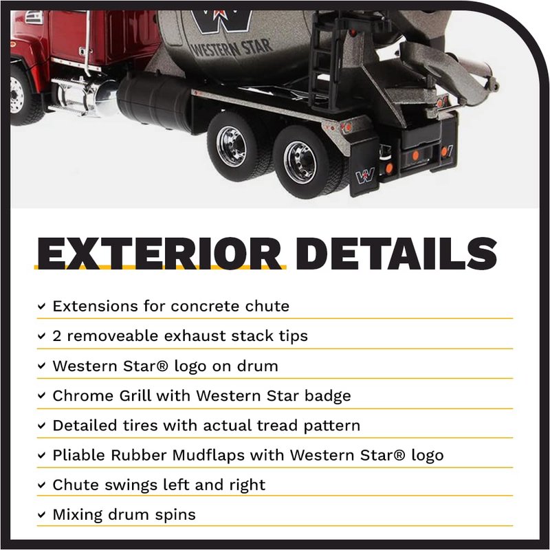 - AUTHENTIC SCALE REPLICA W/ OUTSTANDING DETAILS - Diecast Masters replicas come with accurate interior and exterior details. The Western Star 4700 SF Concrete Mixer has real truck specifications, complete with an opening hood that allows a view of the 12.8 L Detroit DD13 engine (350-505 HP, and up to 1,250-1,850 lb-ft torque). Includes extensions for concrete chute and two removable exhaust stack tips. Chute swings left and right and mixing drum spins.