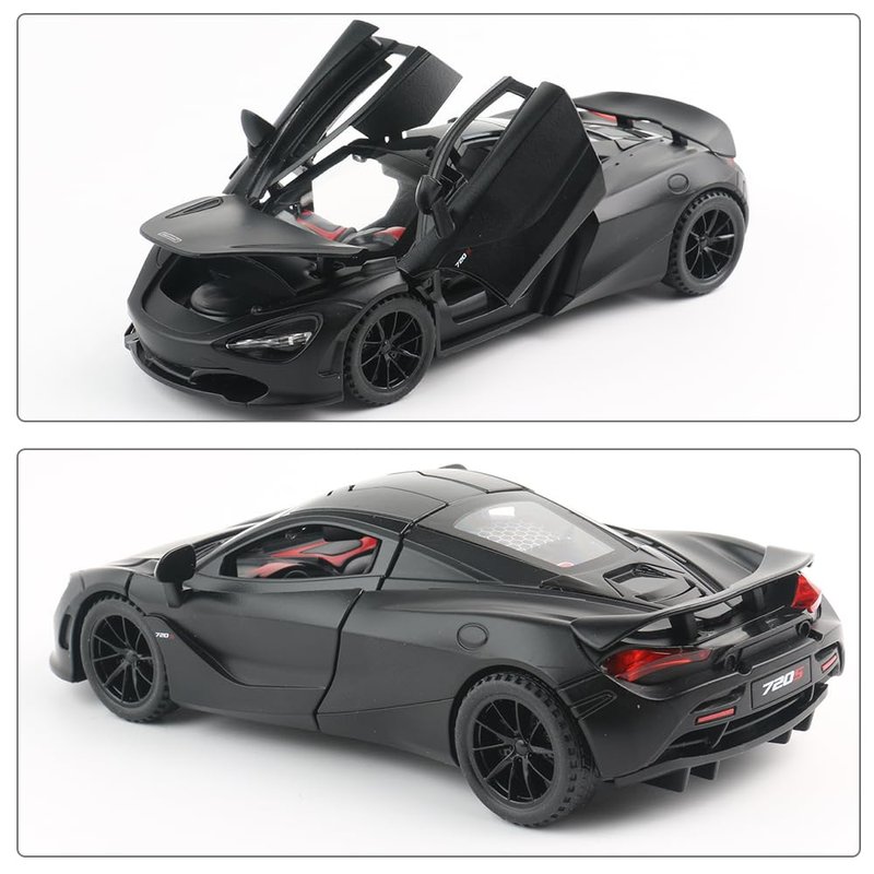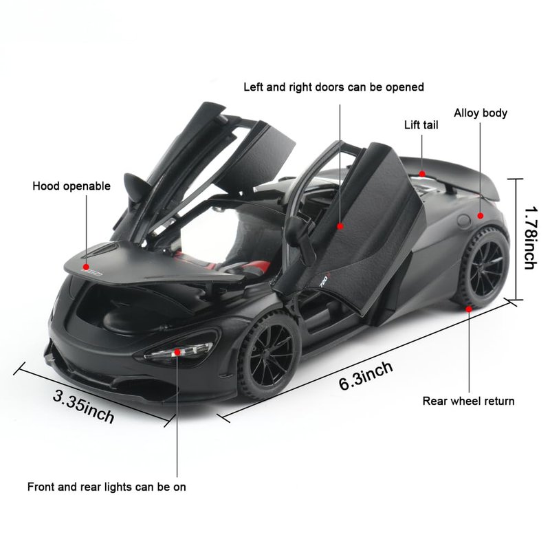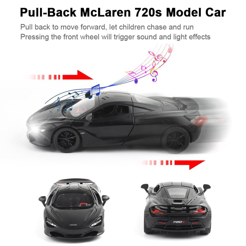 - 🚗【Fun Toy Car】Package include 1 x McLaren 720S Car Model. All Doors,Hood and Tail Can Be Opened,The Front and Rear Are Equipped with High Brightness LED Lights,Engine Sound.When you open its doors,then it can come with music.When you press its car roof,then it can come with music and light.