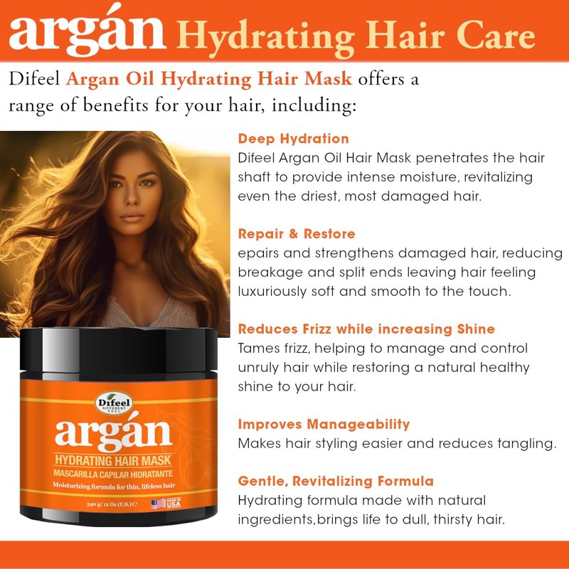 - DEEP CONDITIONING TREATMENT FOR HAIR: Deep Hydration Treatment for Hair: Difeel Argan Hydrating Hair Mask is a deep-conditioning treatment enriched with nourishing Argan oil. It revitalizes and moisturizes dry, damaged hair, reducing frizz, enhancing shine, and promoting overall hair health. The expertly formulated hair mask is a luxurious, pampering treatment that leaves hair soft, silky, and restored.