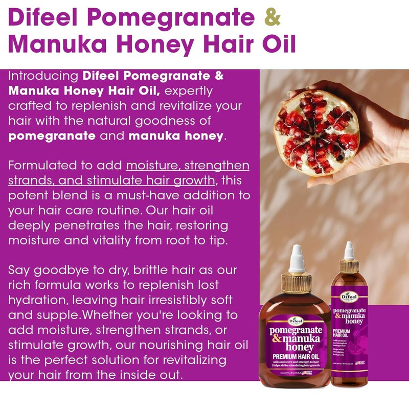 - Strengthens & Moisturizes: Introducing Difeel Pomegranate & Manuka Honey Hair Oil, expertly crafted to replenish and revitalize your hair with the natural goodness of pomegranate and manuka honey. Formulated to add moisture, strengthen strands, and stimulate hair growth, this potent blend is a must-have addition to your hair care routine.