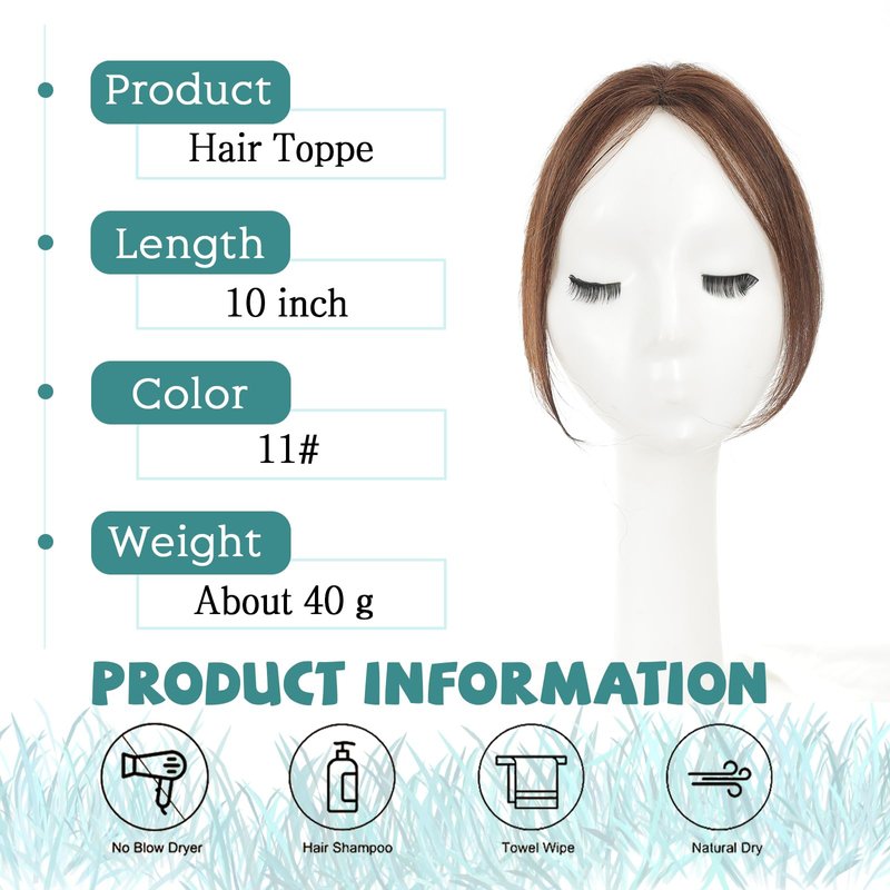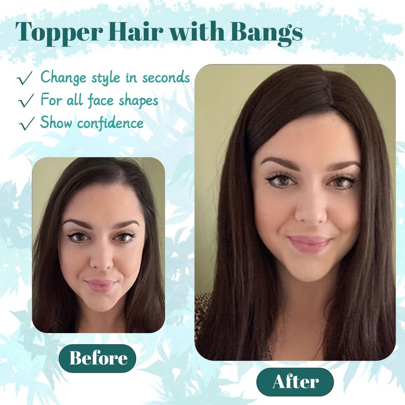 Features:Real Human Hair Topper: Soft and smooth realh Human Hair can blend very well with your existing hair. Unlike synthetic hair our human hair topper with bangs is perfect and durable for daily use on good care. Long service life up to couples of months can provide you the most natural and decent lookInstant Coverage :Save your time on every moming and weekend because it usually takes 1-2minutes to put on our human hair topper with the clips installed. Harmless to your scalp and add instant fullness on your top.Suit for many occasions like daily activity, wedding, prom, graduation and datingStylish Bangs: Clip in hair topper with wispy bangs can decently solve your receding hairline grey hairline or thinning hair problem.Cut or iron the bangs to any styley your like to fit your face .Suitable for covering the top and two sides,not suit for people who want a thick back coverage Color Difference:All photos are taken by ourselves own and pls understand the color difference that miht caused by the difference of lights and monitors .If you are not sure please send us your hair photo taken in natura linht, we will help you to choose the right color