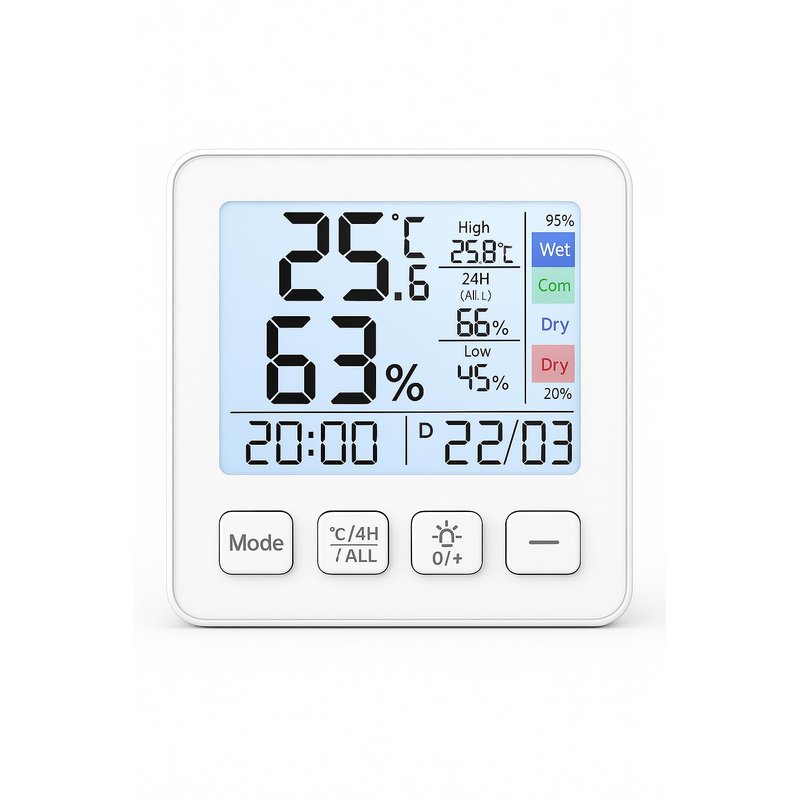 Take control of your indoor environment with this versatile digital thermo-hygrometer. Featuring a clear LCD display with time and date functions, this device precisely monitors temperature from 14°F to 122°F and humidity levels between 20-95% RH. The easy-to-read screen shows current readings along with maximum/minimum values and includes a comfort level indicator to help maintain optimal conditions. Perfect for multiple settings including homes, baby rooms, offices, warehouses, greenhouses, and pharmacies, this monitor helps prevent issues like excess moisture damage to electronics, difficult-to-dry laundry, and uncomfortable living conditions. The compact unit measures just 3.5 inches tall and includes convenient features like adjustable display modes and an intuitive button interface. Whether you're managing storage conditions, maintaining comfort in living spaces, or monitoring sensitive environments, this thermo-hygrometer provides reliable data to help you make informed decisions about humidity and temperature control. Its versatile functionality makes it an essential tool for both residential and commercial applications where environmental monitoring is crucial.