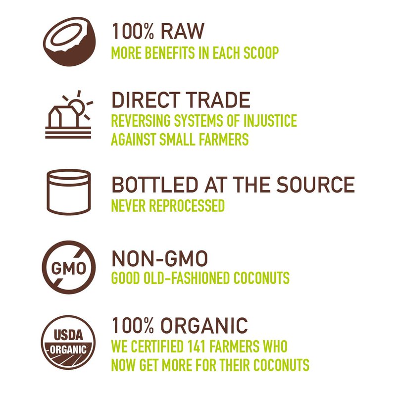 - 100% ORGANIC COCONUT OIL: Located in a pristine remote area of the Philippines, our coconuts are free of pesticides and other harmful chemicals, our coconut farmers are trained in Organic farming methods, and each individual coconut tree is USDA Organic Certified (Over 80,000 trees!)