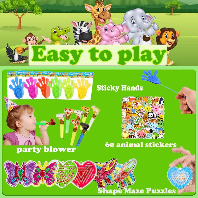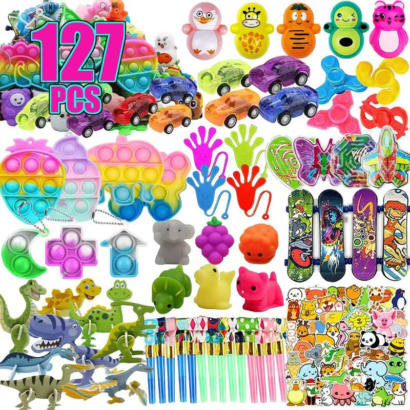 - Premium Party Favor Toys Assortment: You will get 127 PCS party toys for kids, include 60 animal stickers, 12 party blowers, 6 sticky hands, 10 tumbler toys, 5 finger gyro, 4 cute pop keychain, 4 random shape mini pop keychains, 4 mochi squishy toys, 4 pull back cars, 4 mini skateboard, 4 maze puzzles, 10 dinosaur puzzle.