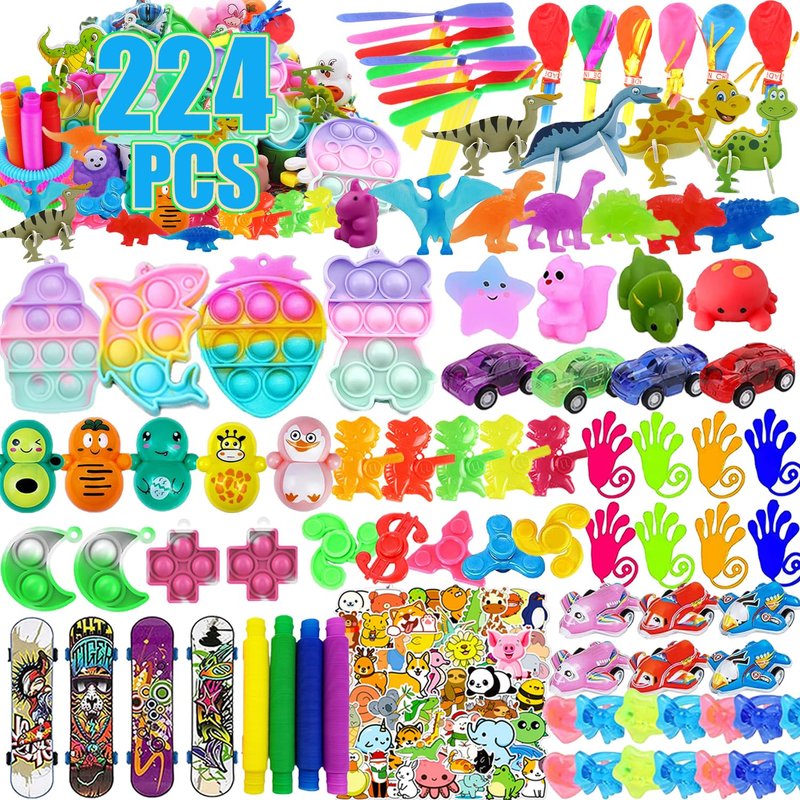 - Premium Party Favor Toys Assortment: You will get 224 PCS party toys for kids, include 60 animal stickers, 10 dinosaur whistle, 10 tumbler toys, 4 sticky hands, 4 finger gyro, 4 cute pop keychain, 4 random shape mini pop keychains, 4 pull back cars, 4 mochi squishy toys, 4 pull back airplane, 3 mini skateboard, 3 pop tubes, 5 mini dinosaur, 15 kid rings, 20 bamboo dragonfly, 20 3D dinosaur jigsaw, 50 party balloon whistle.