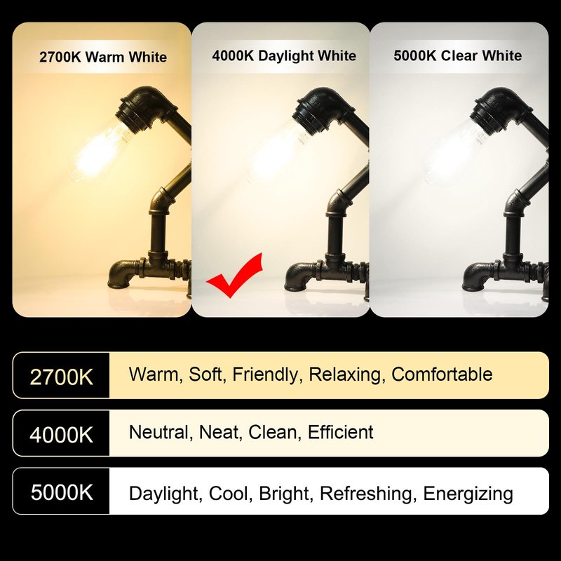 Notice: This E26 edison bulb is very bright. Check out the Lumens(700lm) before purchase.Product Specifications Dimmable Base Type:E26 Color: 4000K Daylight White Luminous Intensity:700lm Watts:6W CRI:≥80 View Angle:280 degree Input Voltage:120VAC Incandescent lamp Equivalent:60-watt Diameter:58mm,Height:126mm Lifespan:20000 Hours Package: 6 x LED E26 ST58 6W Dimmable Filament Bulbs Daylight White 4000K
