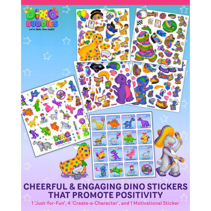 - Create-A-Character Stickers: Includes 4 sheets of laminated vinyl repositionable stickers featuring Rollo, Casey, Bo, and Patches.Each character has a unique personality for kids to get to know and love. Children can mix and match components to design their unique Dino-Buddies characters!