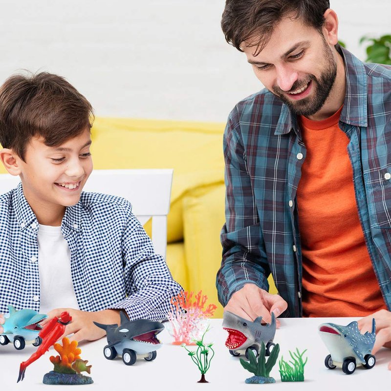 - [THE ULTIMATE OCEAN ADVENTURE SET] This ocean toy playset includes 4 pull back toy cars and 8 accessories. Sea animal pull back cars feature a Great White Shark, Killer Whale, Whale Shark, and Dolphin toys. Accessories include Diver, Coral and Fish, Sea Plant, and Seaweeds. Realistic hand-painted with vibrant detail.