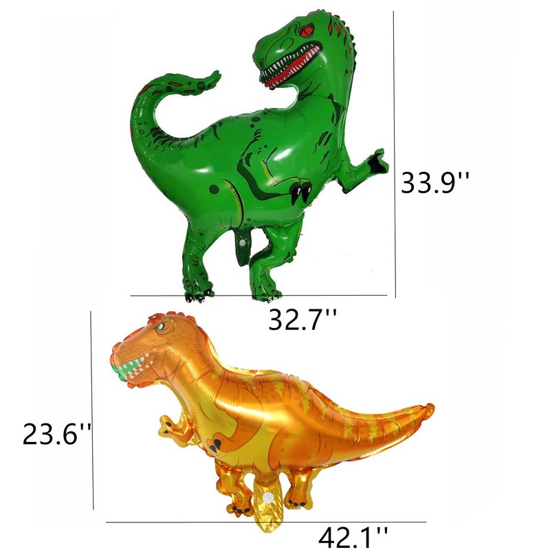 - Dinosaurs Foil Balloon:Red Tyrannosaurus Rex (91x76cm),Long-necked dragon (60x95cm),Green Tyrannosaurus Rex (86x83cm),Yellow Tyrannosaurus Rex (107x60),Horned Dragon (99x75cm),Triceratops (110x60cm),2*Circle Ballons(18inch)