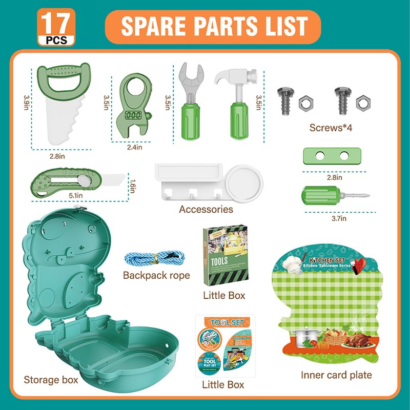 - Dinosaur Kids Tool Set: Our dinosaur tool playset for kids is very realistic and comprehensive to stimulate your child's fine motor skills, kids will love it. The tool kit includes hammer, saw, screwdriver, wrench, pliers, ruler, nuts and bolts.