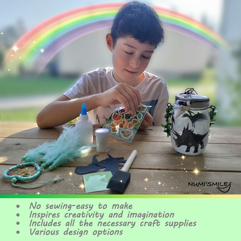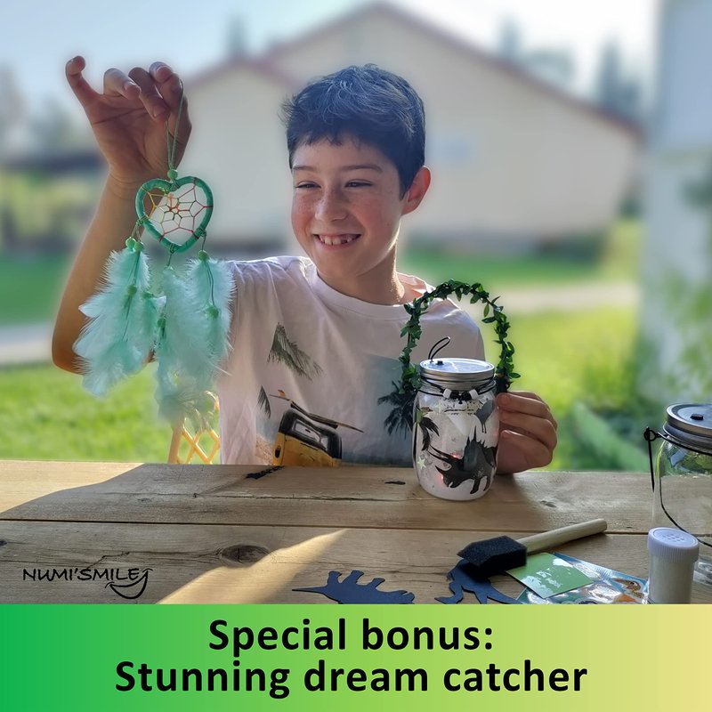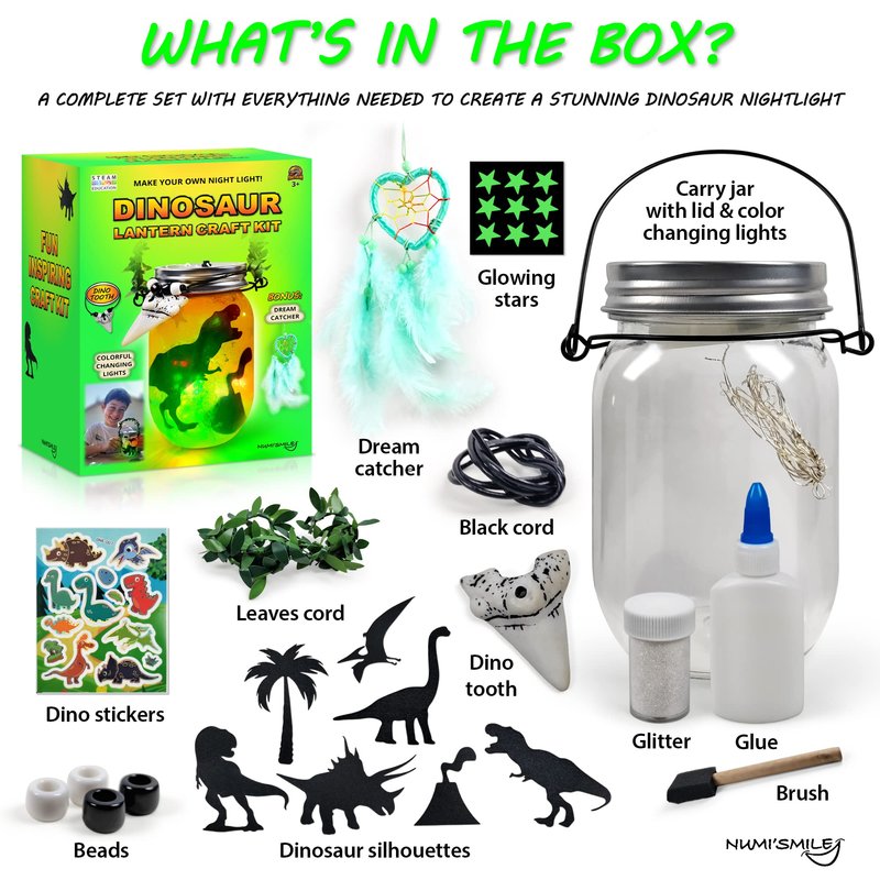 - Unique Gift For Kids: our gift box includes all the necessary craft supplies- 1 plastic jar with handle, metal lid with colorful LED lights, dinosaur tooth and stickers, glitter, black and white beads, glue, sponge brush, leaves cord, black cord, green dreamcatcher, glowing in the dark stars stickers, dinosaurs stickers and lots of dino silhouettes.