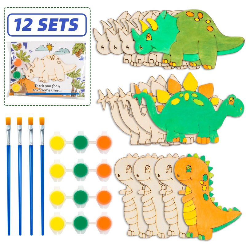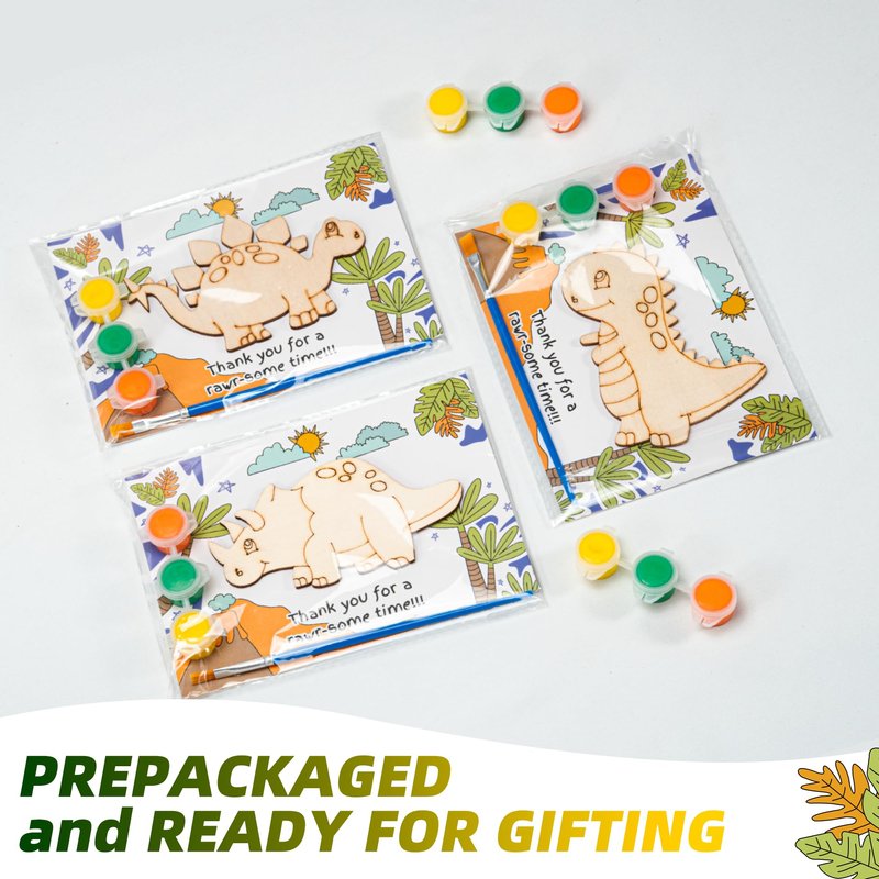 Dinosaur Party Favors - Pre-Packaged Set of 12 DIY Wooden Dinosaur Painting Set with Paint & Personalized Cards