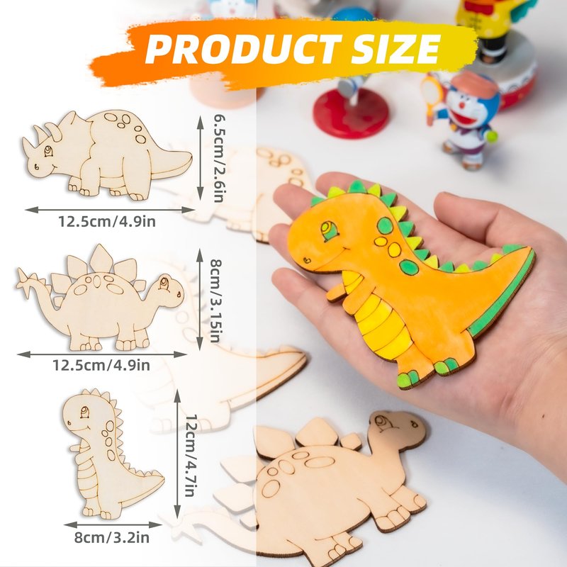 - Whats inside the kit: 3 Wooden Dinosaur Designs: Each kit features three unique wooden dinosaur shapes, ready to be transformed into colorful creations.