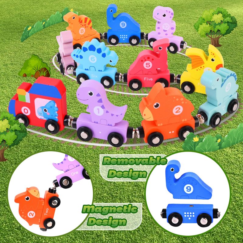 - Magnetic Dinosaur Train Set: Leedelife dinosaur train set is made of high quality wood and has a magnetic design. The removable dinosaurs and train carriages allow children to freely mix and match them and develop their imagination
