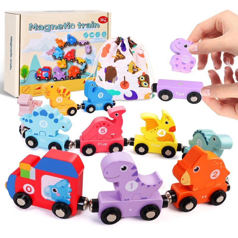 - Perfect Gift for Kids: The magnetic wooden train set includes the locomotive*1, the colorful dinosaur*10, the train car*10, and the cute storage bag*1, which is a perfect birthday halloween christmas gift for boys and girls aged 2 3 4 5 years old