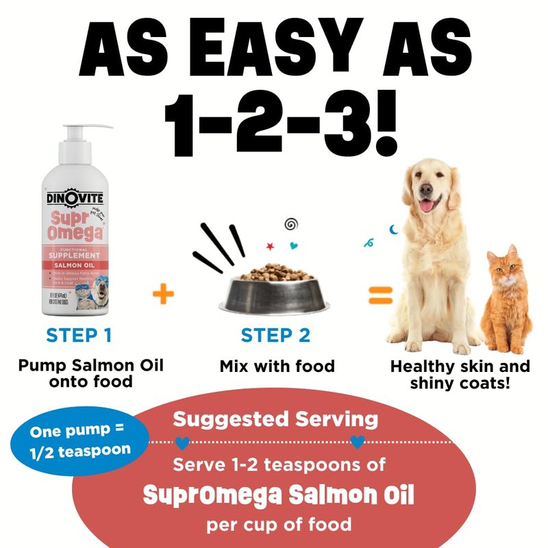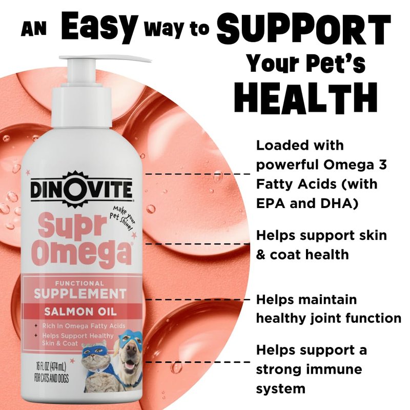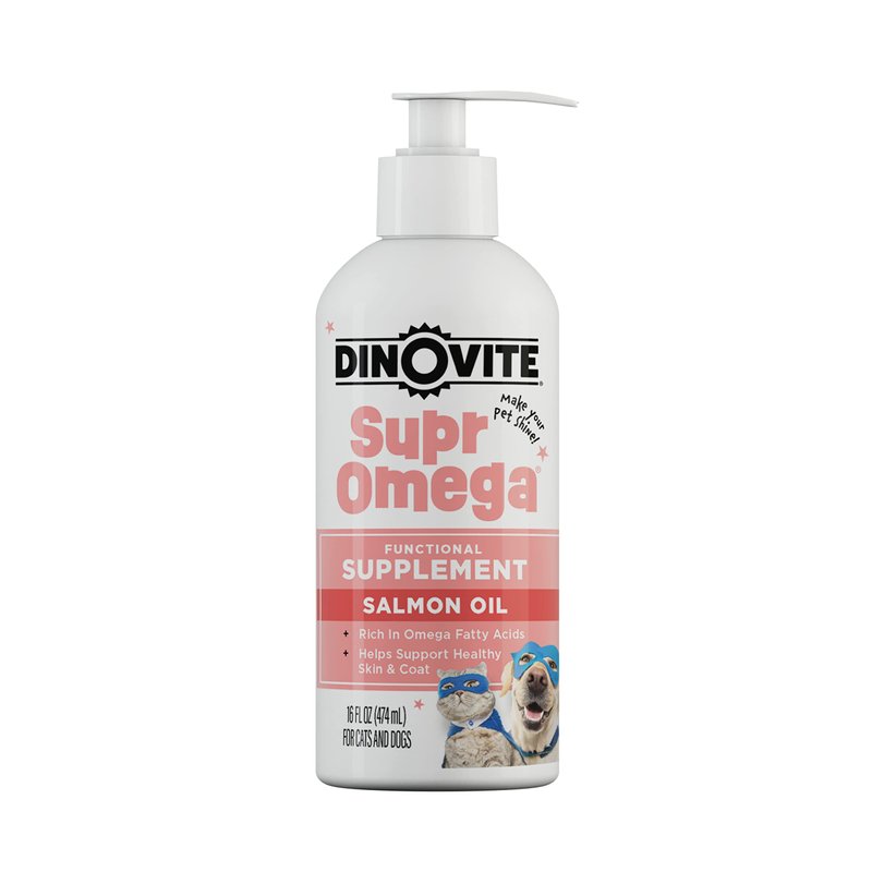 Dinovite SuprOmega Wild Caught Salmon Oil for Dogs & Cats - GMO Free Omega 3 Skin & Coat Supplement - Skin & Coat Meal Topper for Dogs & Cats - 16 oz