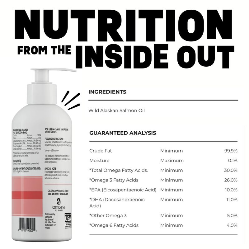 Loaded with powerful Omega 3 Fatty Acids (with EPA and DHA) that help support skin and coat health, joint function, a strong immune system and heart health. Pump some of our SuprOmega Salmon Oil on your pet's meal, and voilà, meal-time is go-time for their energy-abound bodies. Easy to use. Easy to choose. Packed with essential ingredients needed to support overall health.