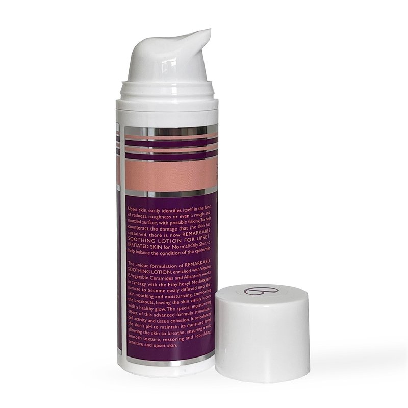 Upset skin, easily identifies itself in the form of redness, roughness or even a rough and mottled surface, with possible flaking. To help counteract the damage that the skin has sustained, there is now REMARKABLE SOOTHING LOTION FOR UPSET IRRITATED SKIN for Normal/Oily Skin, to help balance the condition of the epidermis The unique formulation of REMARKABLE SOOTHING LOTION, enriched with Vitamin E, Vegetable Ceramides and Allantoin works in synergy with the Ethylhexyl Methoxycinnamate to become easily diffused into the skin, soothing and moisturizing comforting the breakouts, leaving the skin visibly lucent with a healthy glow. The special moisturizing effect of this advanced formula stimulates cell activity and tissue cohesion. It rebalances the skin's pH to maintain its moisture level, allowing the skin to breathe, ensuring a soft, smooth texture, restoring and rebuilding sensitive and upset skin