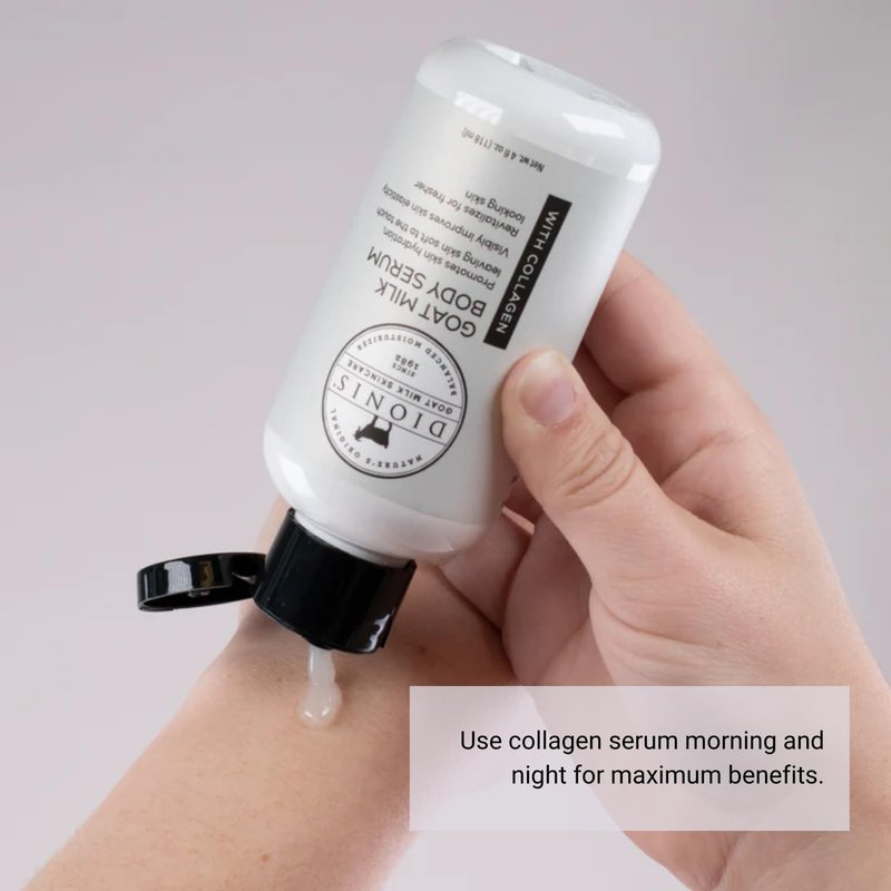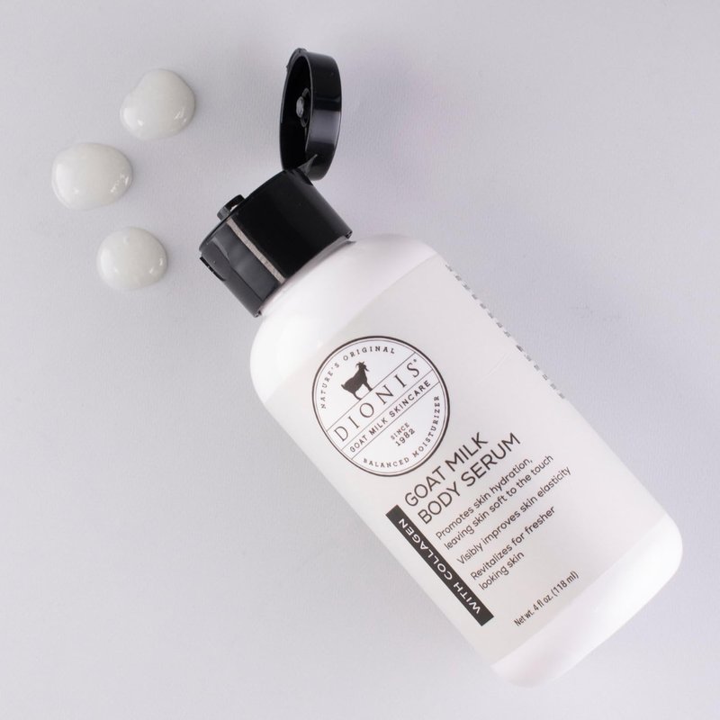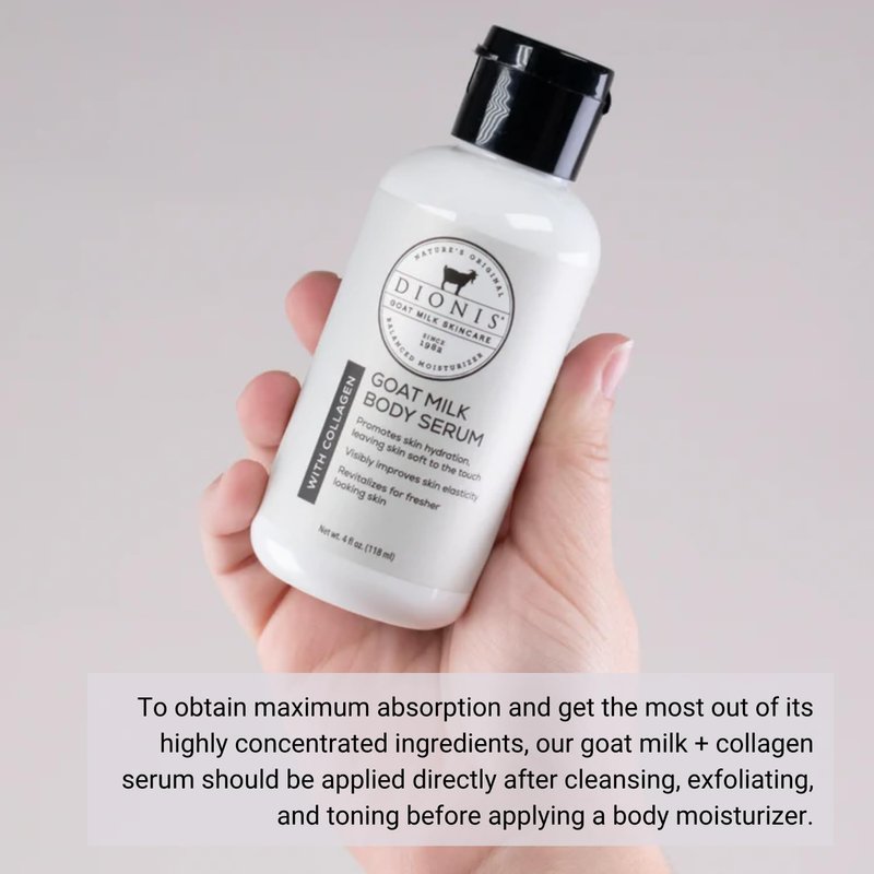 - Lotion For Dry Skin - The Dionis Goat Milk Body Serum absorbs quickly and moisturizes throughout the day. This goat milk body serum with collagen by Dionis is exactly what your skin is craving. Formulated to improves skin elasticity and firmness while making skin brighter and smoothe; this serum will intensely hydrate your skin. This ultra-soaking serum works well for all skin types.
