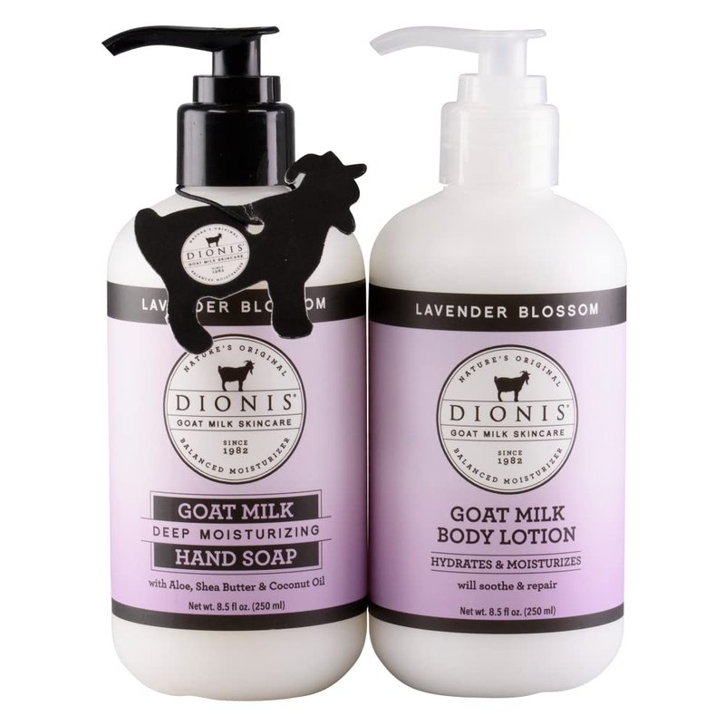 Dionis Goat Milk Skincare Lavender Blossom Body Lotion & Hand Soap Gift Bundle - Lavender Scented Cream & Concentrated Liquid Soap Gently Clean, Moisturize & Nourish Dry Hands, 8.5 oz Pump Bottles