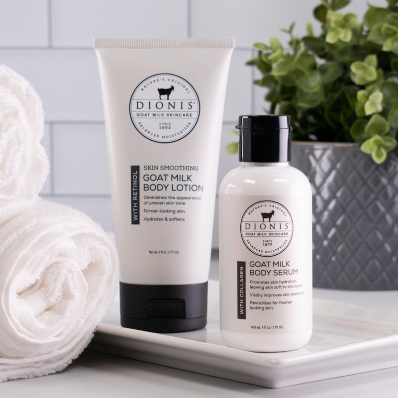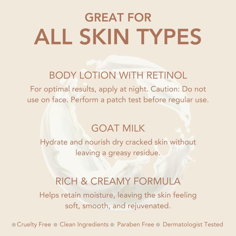 - Hydrating Moisturizer - Our Goat Milk Body Lotion with Retinol will hydrate, soften, and improve skin overall. This lotion smooths and refines your skin's texture and enhances its radiance. This goat milk body lotion with retinol by Dionis is powered by goat milk +retinol to hydrate and soften your skin. This rich and creamy formula will improve your skins elasticity.