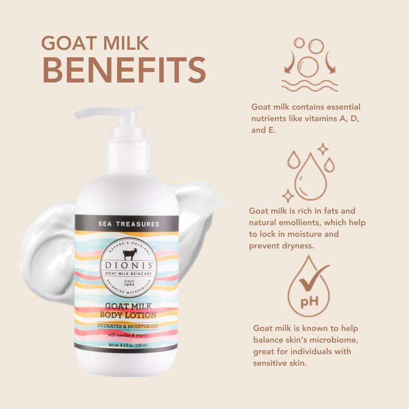 - Skin's Best Friend - The Dionis goat Milk Skincare Lotion is rich and creamy. With regular use it’s designed to ease rough skin, making it smooth and silky. It also does not leave a greasy residue like many lotions, so you can apply it right before putting on your favorite sweater.