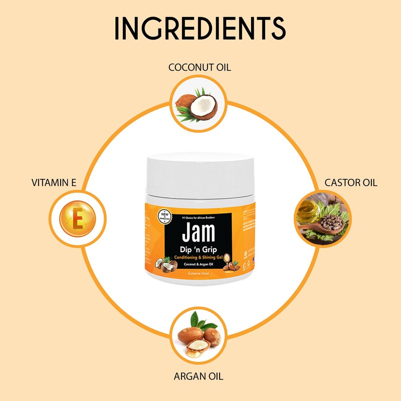 Jam Dip n Grip Hair Care Conditioning & Shining Gel. This 6oz gel provides extreme hold and high shine, perfect for taming frizz and defining your style. Infused with nourishing Argan Oil, Coconut Oil, Vitamin E, and Castor Oil, this versatile gel delivers deep conditioning and a radiant shine for all hair types. Jam Dip n Grip ensures your hair stays sleek and controlled. To use, simply scoop out a small amount with your hand and apply it to your hair, working it from the scalp outward. Separate your hair into sections and twist each section using a hand twist, comb twist, or double twist technique to achieve your desired look. Jam Dip n Grip. Its powerful formula not only holds your style in place but also nourishes your hair, promoting health and vitality. Say goodbye to frizz and hello to stunning, shiny hair that lasts all day. Whether you're going for a polished professional look or a creative protective style, Jam Dip n Grip is your go-to solution for impeccable hair.