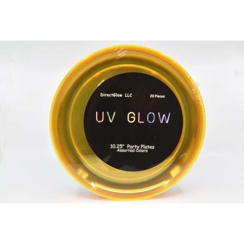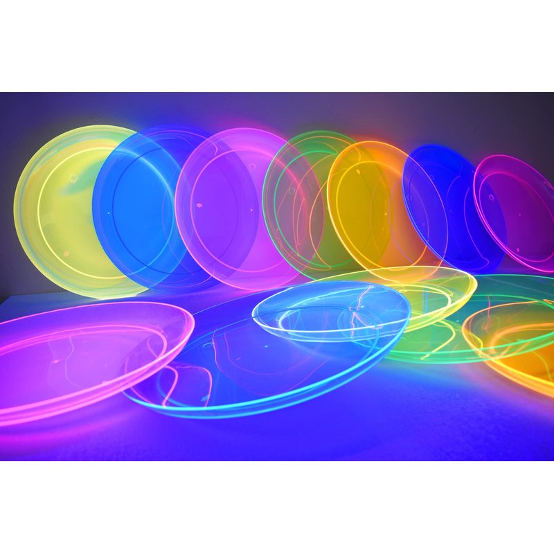 - These specially made 10.25 inch neon plates from DirectGlow are designed to be highly neon in normal light and glow incredibly bright in blacklight! They do NOT glow in the dark by themselves. Blacklight required for the same pictured effects.