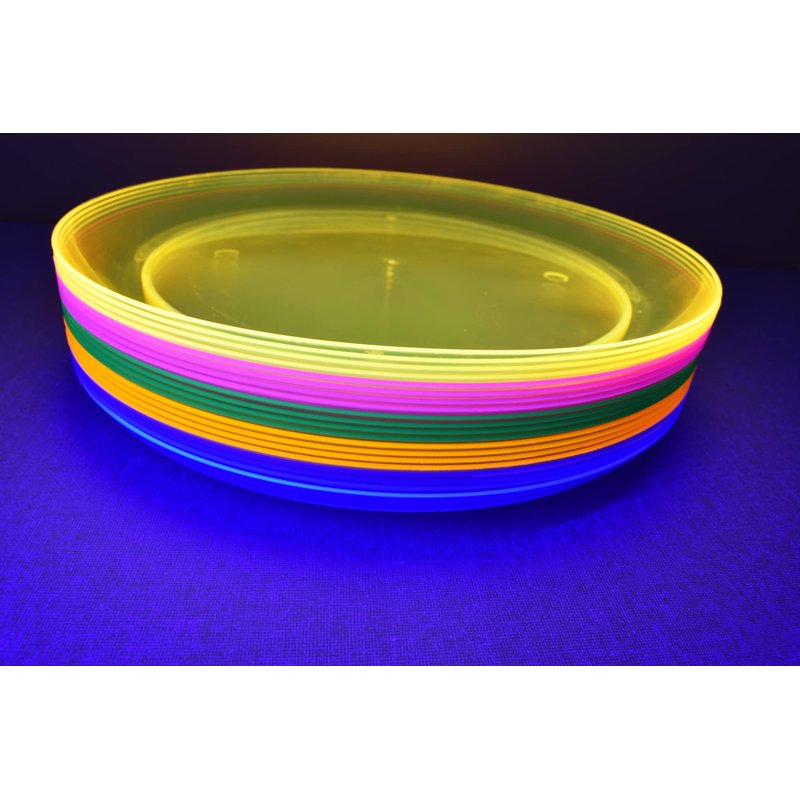 These disposable bright neon blacklight reactive plates are 10.25 inches wide and come 40 pieces to each pack. They are constructed of hard plastic, yet have a good amount of flexibility making them safe and ideal for kids and adults alike. With a great mix of colors including blue, green, yellow, orange and pink; these plates shine brilliantly in blacklight. They are perfect for appetizers, cake, snacks, desserts and finger foods. Can be reused with careful hand washing. Use them for any event that uses blacklight to include glow parties, birthdays, holidays, concerts, festivals, themed events and much more! Mix with any of our quality ultraviolet cups, bowls, cutlery, and serve-ware for your glow party! These quality bright fluorescent plates by DirectGlow will make your next glow in the dark party a memorable one.