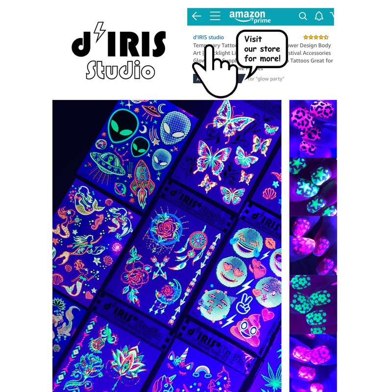 - Safe Blacklight Temporary Tattoos: d'IRIS studio's glow in the dark temporary tattoos are the best neon body stickers / Rave jewelry with a backlight glow. Safe for your skin and environment, these glow in the dark flash tattoos are must-have glow accessories for adults.