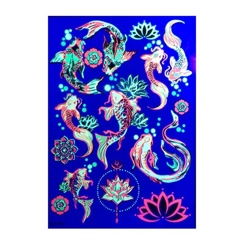 d'IRIS studio Blacklight Temporary Tattoos – 1 Sheet Koi Fish Design Body Art | Festival Accessories Glow Party Supplies | 7.2” x 5.2” UV Reactive Temp Tattoos Great for EDM EDC Party Rave Parties
