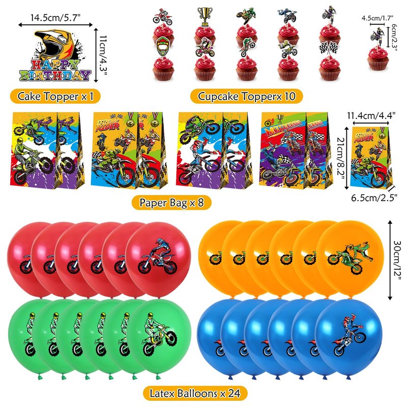 - Package Quantity: Include 1 x happy birthday banner,1 x tablecloth,10 x cupcakes, 7 hanging swirls, 8 x dirt bike paper gift bags, 1 x cupcakes, 20 x latex balloons, 2 x balloon ribbons, glue points also provided.