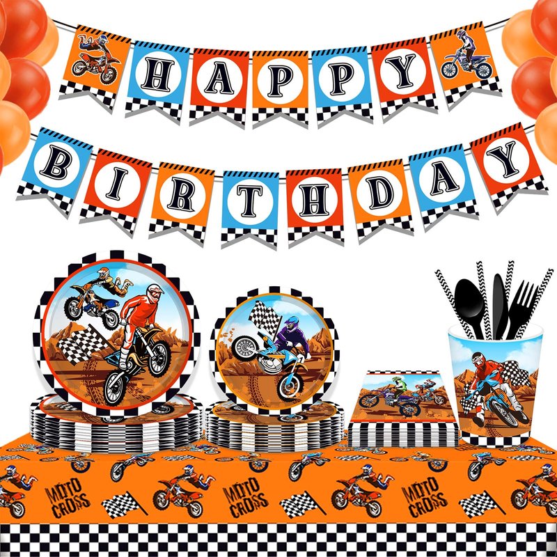 - Motorcycle Party Tablecovers: the checkered party tablecloth is printed with checkered flag pattern representing the arrival of the finish line, together with the racer speeding on the motorcycle, the desert colored background, suitable for people who like racing to celebrate their birthdays