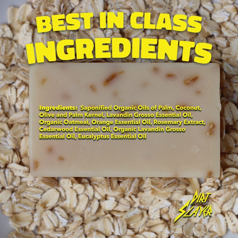 A blend of lavender and oatmeal with subtle hints of orange, cedarwood, eucalyptus and rosemary. This bar helps to gently EXFOLIATE and nourish the skin. It's gentle enough for the FACE, strong enough for the BODY and is a great SHAVING BAR. This bar works with all skin types but kicks it up a notch for dry skin. Dirt Slayer prides itself on producing natural soap and personal care products that are strong enough to get your skin clean without harsh or artificial ingredients. Each bar of soap is carefully crafted with BEST IN CLASS ingredients.