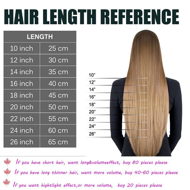 - 【Different Lengthes Have Different Grams】-- 14'': 70g, 16''-18'': 80g, 20''-22’’: 100g. If you have thin hair, suggest 1-2 sets to add length, if you want to add weight, suggest 2-3 sets. Different lengths have different grams to meet your different needs, less pressure to your head scalp but same hair style effective as other hair extensions like clip in hair extensions, tape in hair etc.