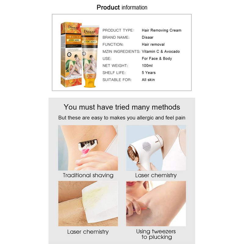 DISAAR BEAUTY Vitamin C Avocado Face Body 3-minutes Quick Hair Removal Cream Depilating Moisturizing Skin 100ml