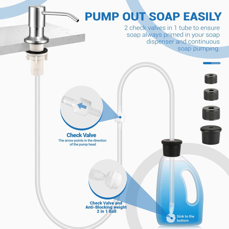 - 4 multiple caps to fit most kitchen soap bottles. A check valve and pp ball keep soap primed!