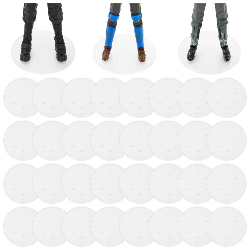 - EXCLUSIVE DESIGN: Contains 32Pcs Figure display bases,These new stands come with a multi peg option - we have tested them on pretty much every figure that has been released , then we are confident that at least one of the pegs will work with each figure,allowing your Figure toy two feet to perfectly fit the base for a more perfect display,you can display your favorite figures on it, because of its stability you don't have to worry about it falling down easily