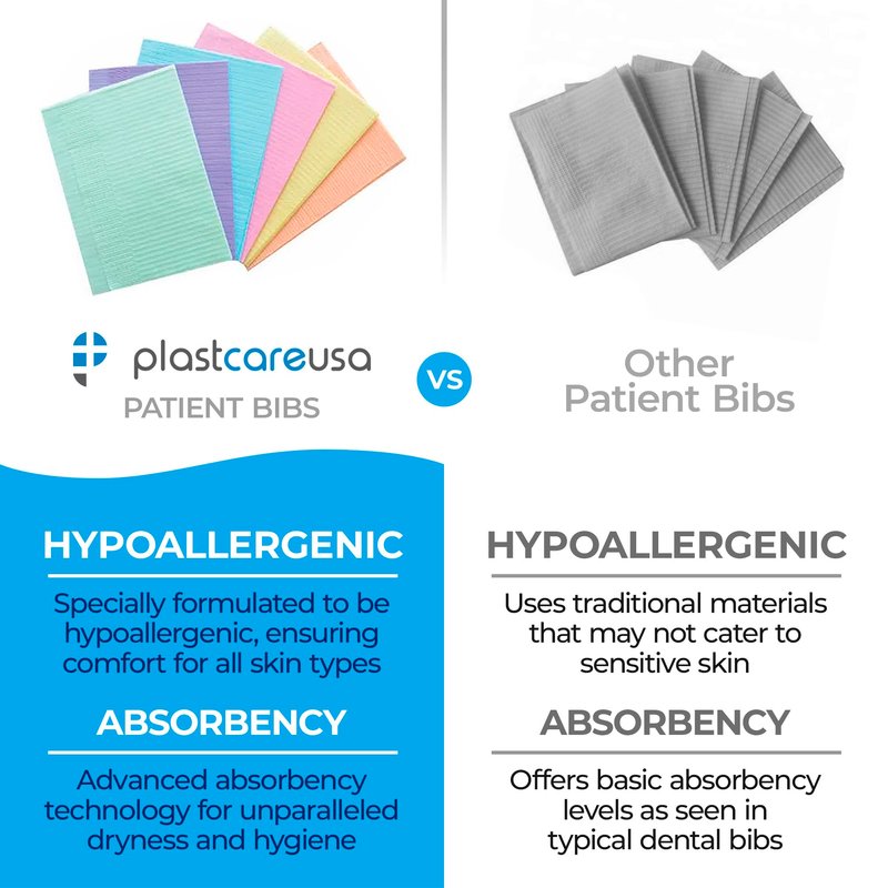- DISPOSABLE ADULT BIBS: Avoid spreading germs in your workspace with these European-made flat bib sheets by PlastCare. We designed these bibs with 2-ply paper and 1-ply poly to provide maximum protection. The bibs are waterproof, making them ideal for keeping patients clean in dental offices or other medical offices.