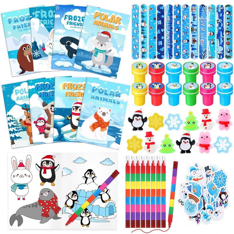 - Polar Animals Theme Gifts: our winter classroom gifts set includes 12 winter coloring books, 12 stress balls, 12 snowflake slap bracelets, 12 colorful crayons, 12 cute stampers and 50 stickers. Students alike will love them for their parties