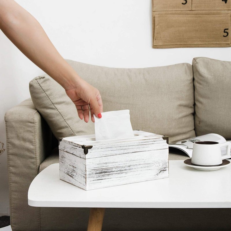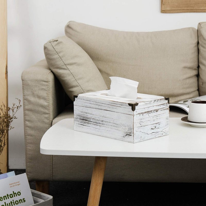 Distressed Wooden Rustic Facial Tissue Box Holder Tissue Box Cover Napkin Dispenser for Bathroom Living Room Dining Room Bedroom Toilet (Washed White)