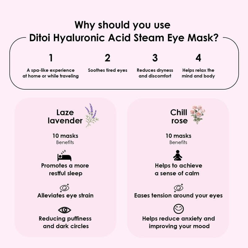 - 【Rose Steam Eye Mask】The Ditoi Steam Eye Mask uses rose essential oil, combined with steam and hyaluronic acid hot compress, to feel the fragrance of rose essential oil, allowing people to easily enter a sleep state, while providing vitality and soothing effects for tired eyes.