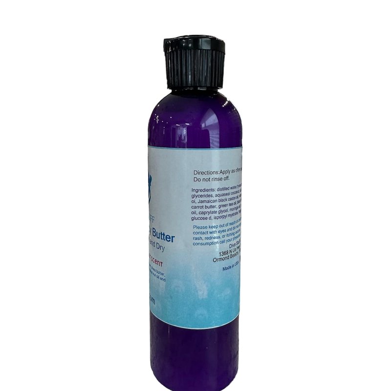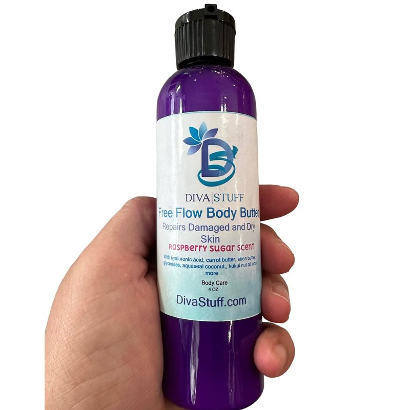 Free flowing body butter is creamy and sinks into the skin quickly. Made mostly of butters and oils and hyaluronic acid. The water content is very low. This is the most delectable moisturzing butter because it applies like a cream and helps to give your skin a smoother texture and feel soft and supple. Smells amazing too. Perfect for after sun, pre sun, after swimming, dry winter skin , etc. Comes in a 4 ounce bottle
