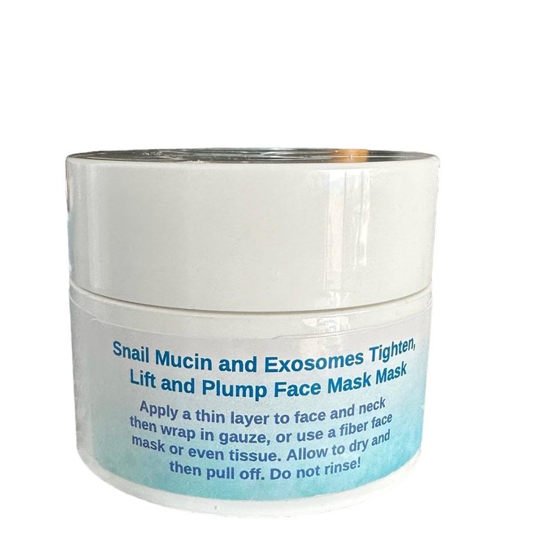 Our high end face mask is made with Korean Snail Mucin and Exosomes. Exosomes are beneficial for skin care and can help with aging skin, wound healing, pigmentation, redness, damaged or compromised skin, and large pores. They are filled with proteins, lipids, and other molecules that promote healing, hydration, and skin protection. Exosomes stimulate cell regeneration and boost collagen production. The jar comes with a cute spatula to apply the mask with. Just apply a thin layer over skin then use gauze or tissue over your face. Allow to dry and then remove gauze or tissue. Do not rinse off. Other highly beneficial ingredients include: hyaluronic acid, white orchid milk, rosemary extract, rooibis tea extract, argireline amplified, green tea extract,sour cherry oil , coconut oil and so much more.