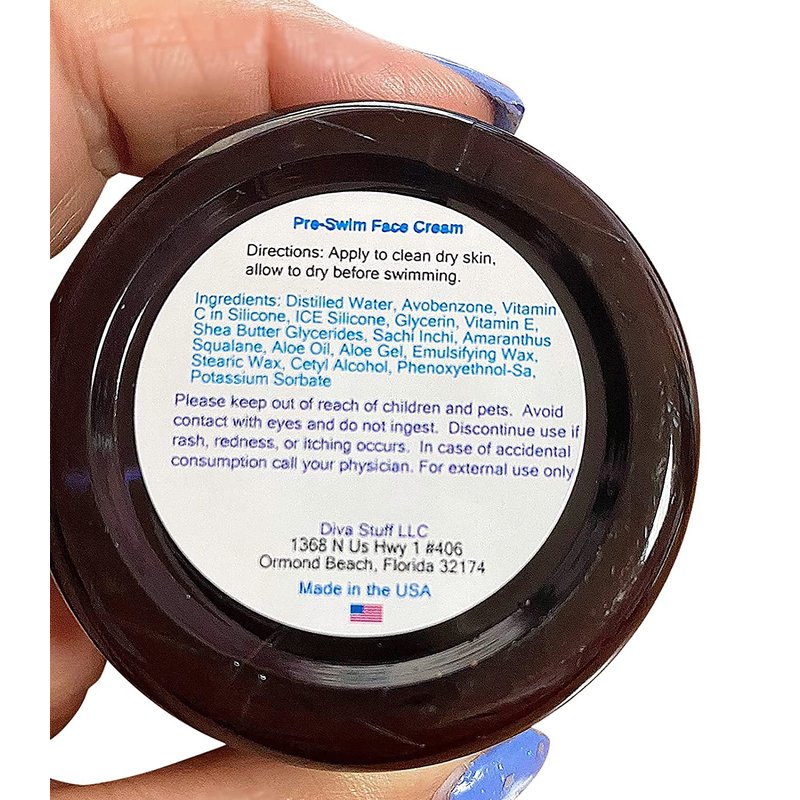 The newest addition to our best selling Pre Swim Cream is one that is specially formulated for the face. It is unscented and contains ingredients to help resist water, keep skin gently moisturized, protected from UVA rays which cause skin to age quickly, and itch free. The vitamin c neutralizes the chlorine while ingredients like amaranthus extract help to control itch. Vitamin e, aloe oil an shea butter gently moisturize without causing pores to become clogged. 2 ounce jar of product!