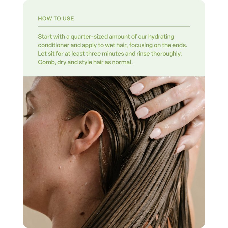 - EASY TO USE: Start with a quarter-sized amount of our hydrating conditioner and apply to wet hair, focusing on the ends. Let sit for at least three minutes and rinse thoroughly. Comb, dry and style hair as normal.