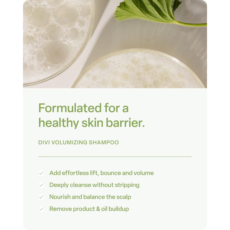 - CAREFULLY FORMULATED: Divi’s hair volume shampoo is crafted with the perfect blend of green tea, tea tree, microalgae, glucosamine & biotin. Our shampoo for fine hair is formulated to cleanse, nourish & balance the scalp for a healthy skin barrier.