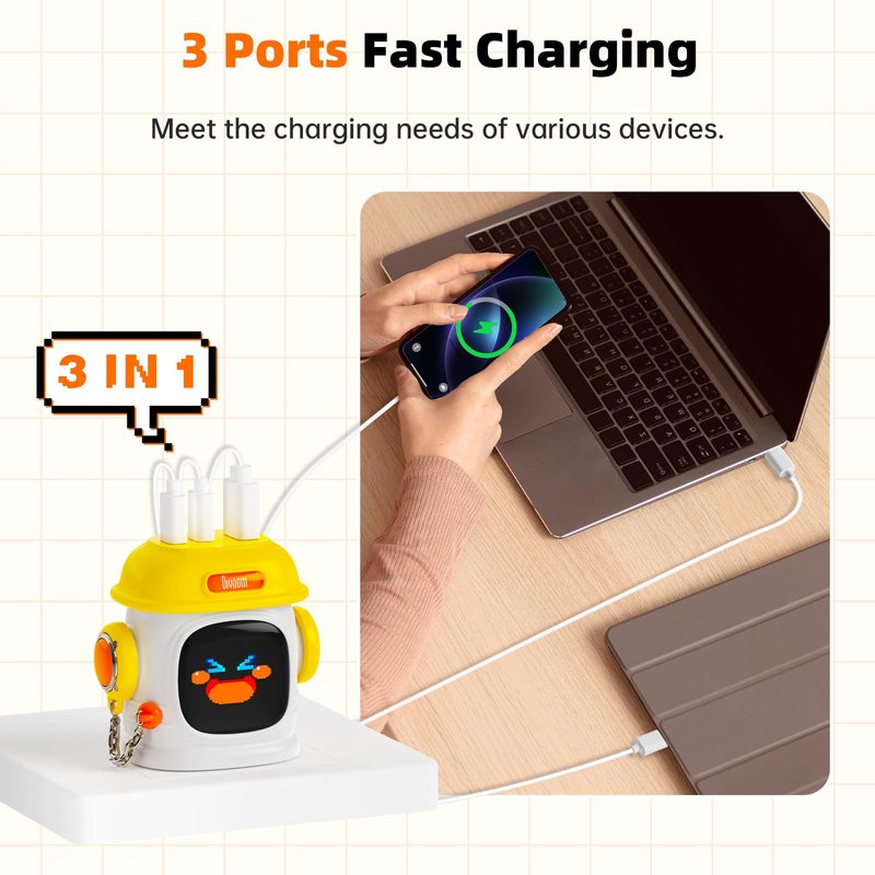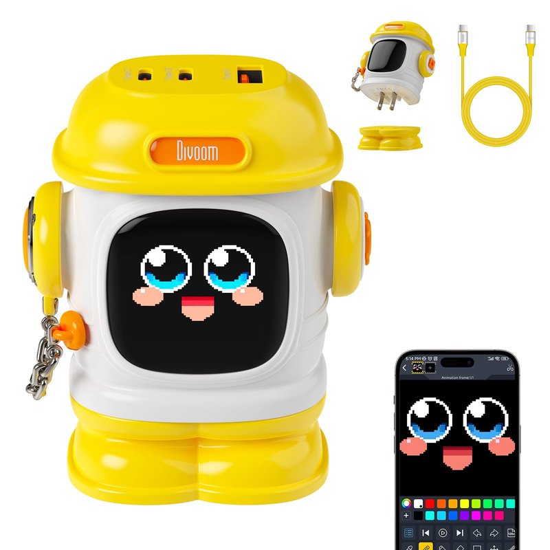 The Divoom Dipow-65 is a powerful 65W USB-C charger that combines cutting-edge technology with a unique design. Featuring GaN technology, it offers faster charging with better efficiency and less heat in a compact form. Its versatile 3-port setup includes two USB-C ports and one USB-A port, allowing you to charge multiple devices simultaneously. The standout feature is its DIY pixel display, where you can create custom designs, animations, or even dynamic clock faces, making charging both practical and fun. With its foldable plug and travel-friendly size, it's perfect for use at home or on the go. Packaged in a stylish gift box, the Dipow-65 also makes an ideal gift for the upcoming holidays like Halloween, Thanksgiving, and Christmas, delighting tech enthusiasts and gadget lovers alike.