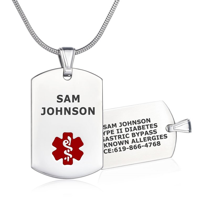 - π STYLISH & FUNCTIONAL: designed and made for safety in style. Stylish medical alert ID necklace for men / women with wear resistant deep custom laser engraving in high contrast white-on-black laser engraving to personalize your medical message (Front: 2 lines of 11 characters, Back: 5 lines of 18 Characters, spaces included).